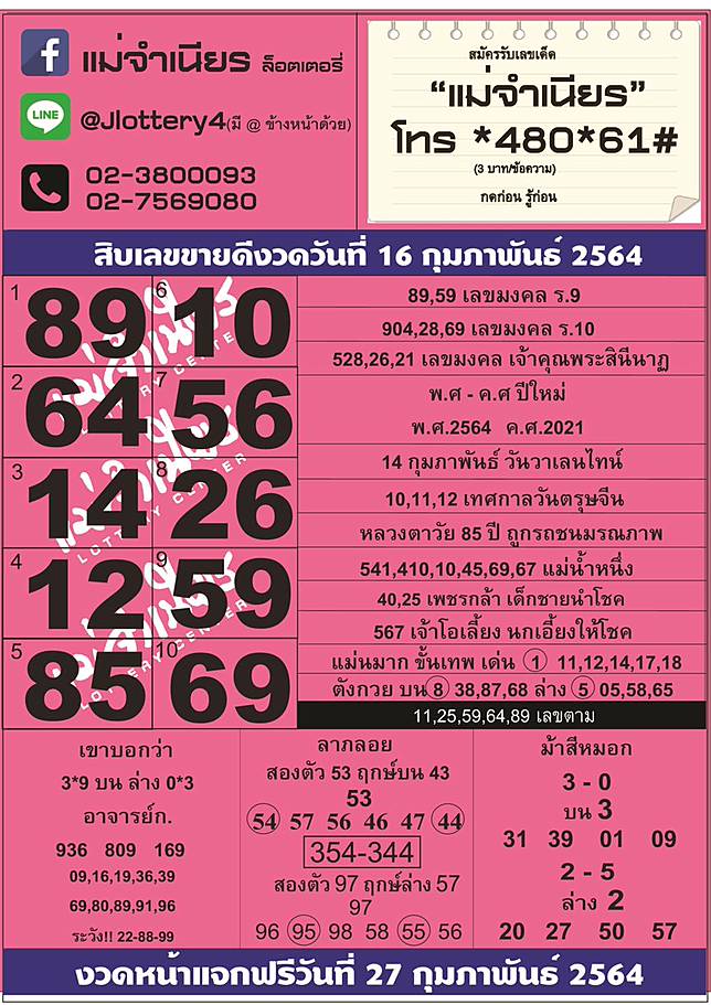 แม่จำเนียรล็อตเตอรี่ กับหวย คนสัมผัสเลข งวดวันที่ 16/02/64 next post next post: แม่น้ำหนึ่ง. หวยแม่น้ำหนึ่ง 16/02/64 ซึ่งมีการแจกเลขเป็นชุดข้อมูลหลักสิบ หรือ หลักสิบเลขท้ายสองตัว โดยจะแบ่งเป็นตัวเลขสองตัว และ เลขสามตัว